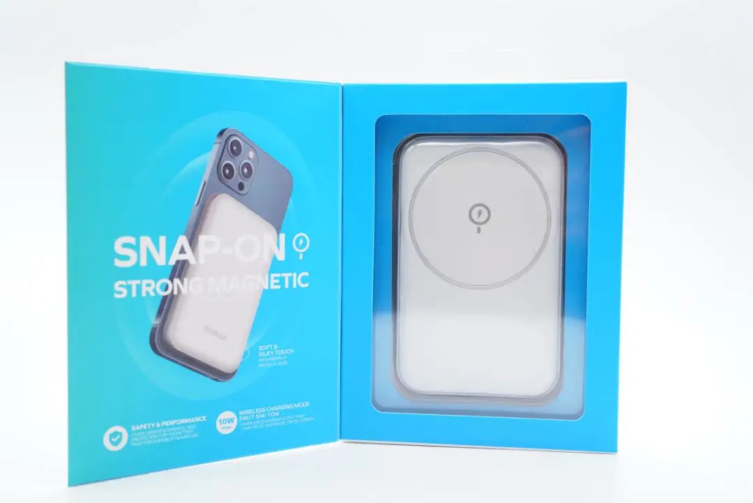 包裝盒書本式設(shè)計,封面另一面印有產(chǎn)品使用場景圖,透過櫥窗可見充電寶實體,展示效果好。
