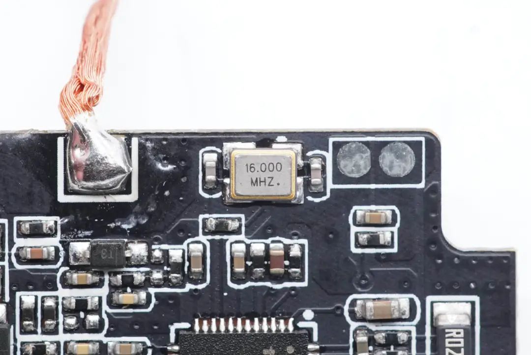 上層小板是無線充電路板,正面設(shè)有無線充電發(fā)射芯片、MOS管以及NPO諧振電容,并焊接無線充電線圈。