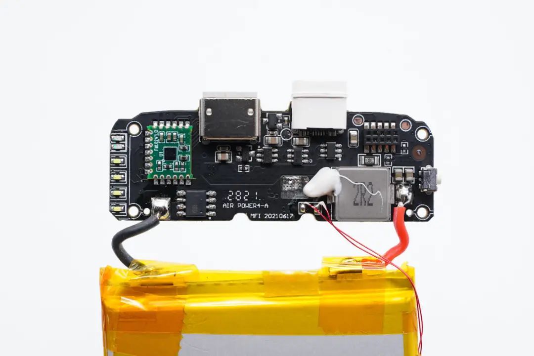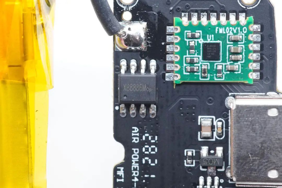 充電頭網(wǎng)通過拆解了解到,充電寶內(nèi)置兩塊PCB小板,之間有泡棉支撐。無線充方案采用美芯晟MT5811,這是一款高度集成的無線充電發(fā)射芯片,符合Qi標(biāo)準(zhǔn)以及高達15/50W的輸出功率,還集成ARM M0 處理器,總的來說在體積、兼容性、性能、效率等方面的表現(xiàn)都很好,能夠滿足客戶的各種要求。