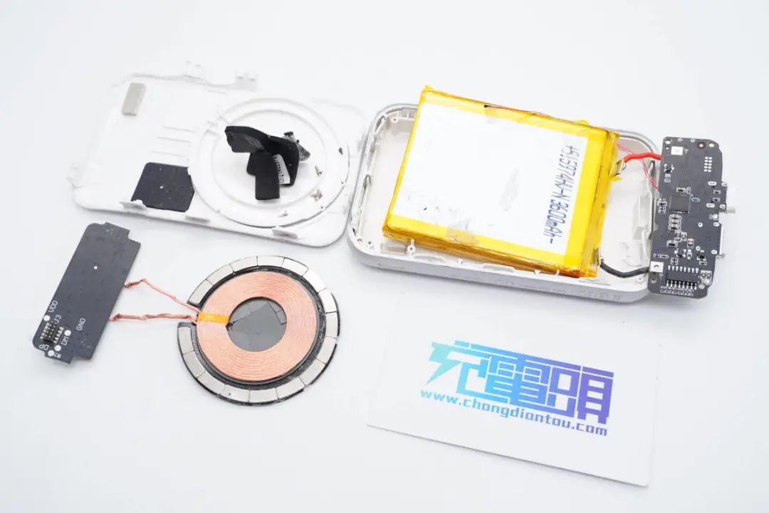 從型號來看最直觀的就是這款充電寶通過了蘋果MFi認證,因此無論是性能還是質(zhì)量都是有保證的。充電寶支持10W磁吸無線充,通過了Qi認證,因此對主流品牌手機都有很不錯的兼容性,而這都得益于產(chǎn)品采用了美芯晟MT5811無線充方案。下面充電頭網(wǎng)就對這款充電寶進行詳細拆解,看看其具體用料做工如何。