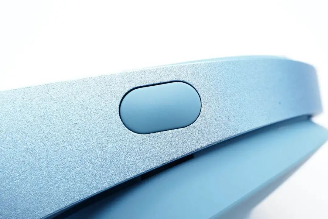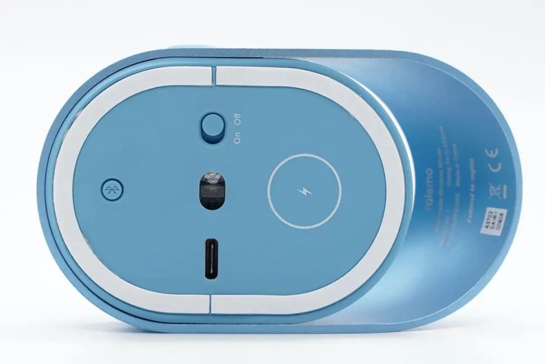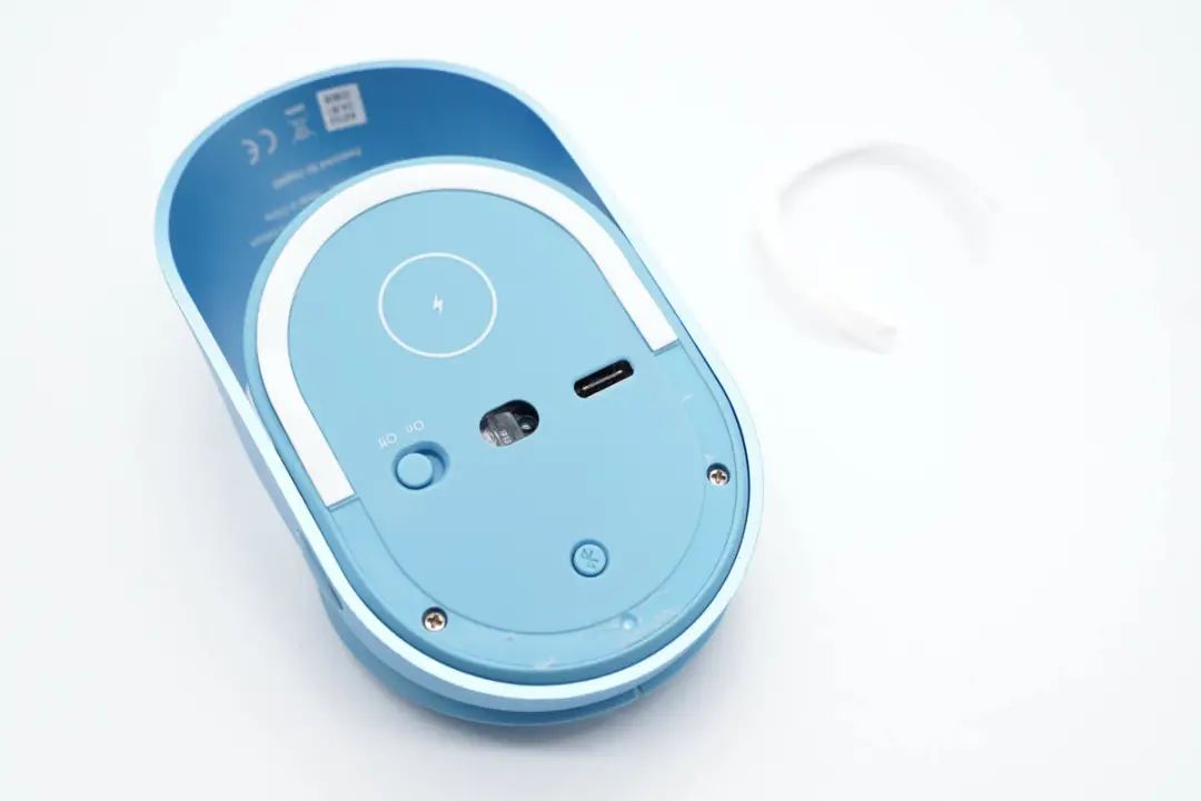 鼠標(biāo)底部邊緣貼有白色聚四氟乙烯腳墊,兩端分別是藍(lán)牙鍵和無線充電標(biāo)識,兩側(cè)是USB-C充電口和電源鍵。