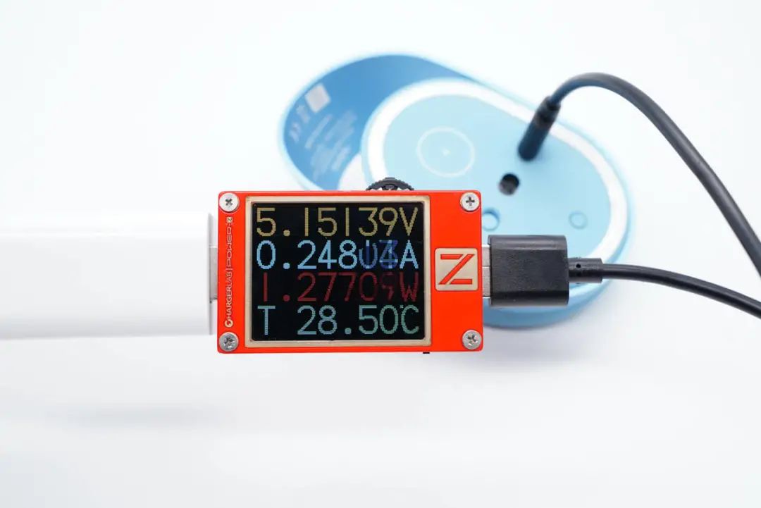 另外進(jìn)行有線充電測試,使用KT002可以測得充電功率為5.15V 0.25A 1.28W。