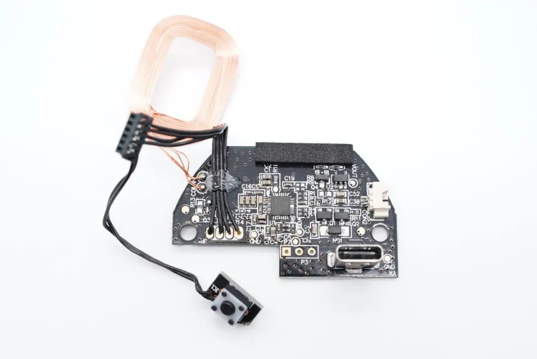 充電頭網(wǎng)通過拆解發(fā)現(xiàn),鼠標(biāo)內(nèi)部設(shè)有充電和控制兩塊PCB板,PCB板之間以及和電芯均采用導(dǎo)線插拔式連接,組裝方便。充電小板上設(shè)有USB-C和無線充電接收線圈兩者充電方式,其中無線充電路采用美芯晟MT5705無線充電接收芯片,該芯片不僅轉(zhuǎn)換效果高,而且擁有完善的保護(hù)機(jī)制,符合最新WPC Qi規(guī)范,非常適合TWS耳機(jī)充電倉等各類小功率智能設(shè)備。