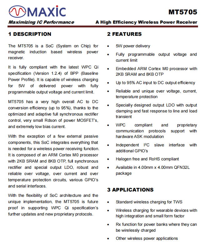 MT5705可提供穩(wěn)定的5W輸出功率,支持輸出電壓5V和電流最大1A,AC to DC轉(zhuǎn)換效率達(dá)95%;其擁有完善的過壓、過流、過溫保護(hù)機(jī)制,獨立的I2C通信接口和豐富的GPIO。封裝為4.00mm x 4.00mm QFN32L,尤其適合TWS耳機(jī)充電倉等各類小功率智能設(shè)備。