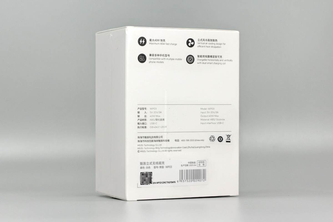 包裝盒為白色,設(shè)計(jì)也比較簡(jiǎn)潔,正面印有MEIZU品牌、無(wú)線充外觀和名稱。