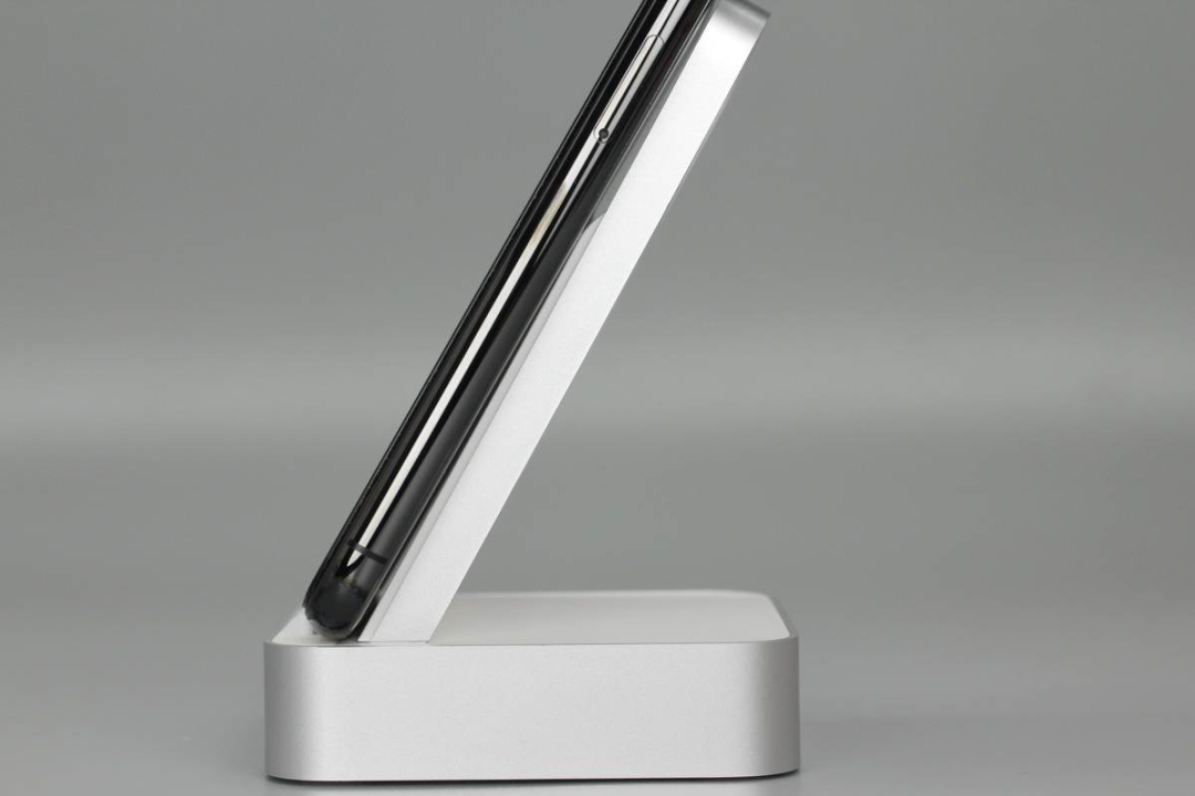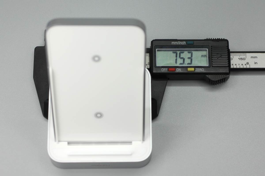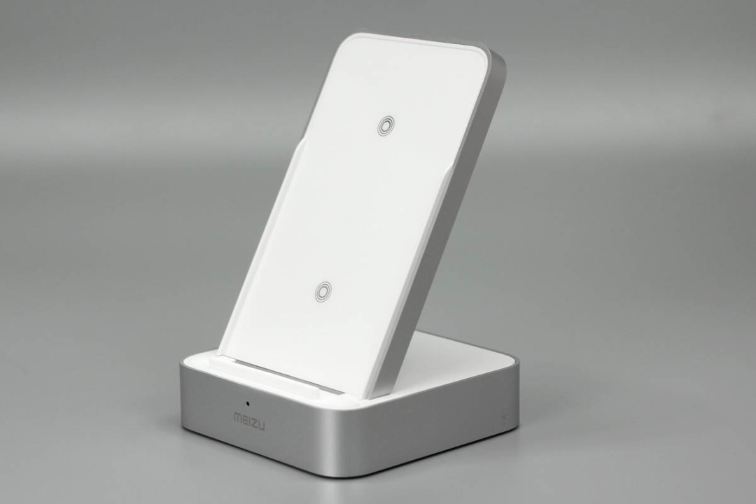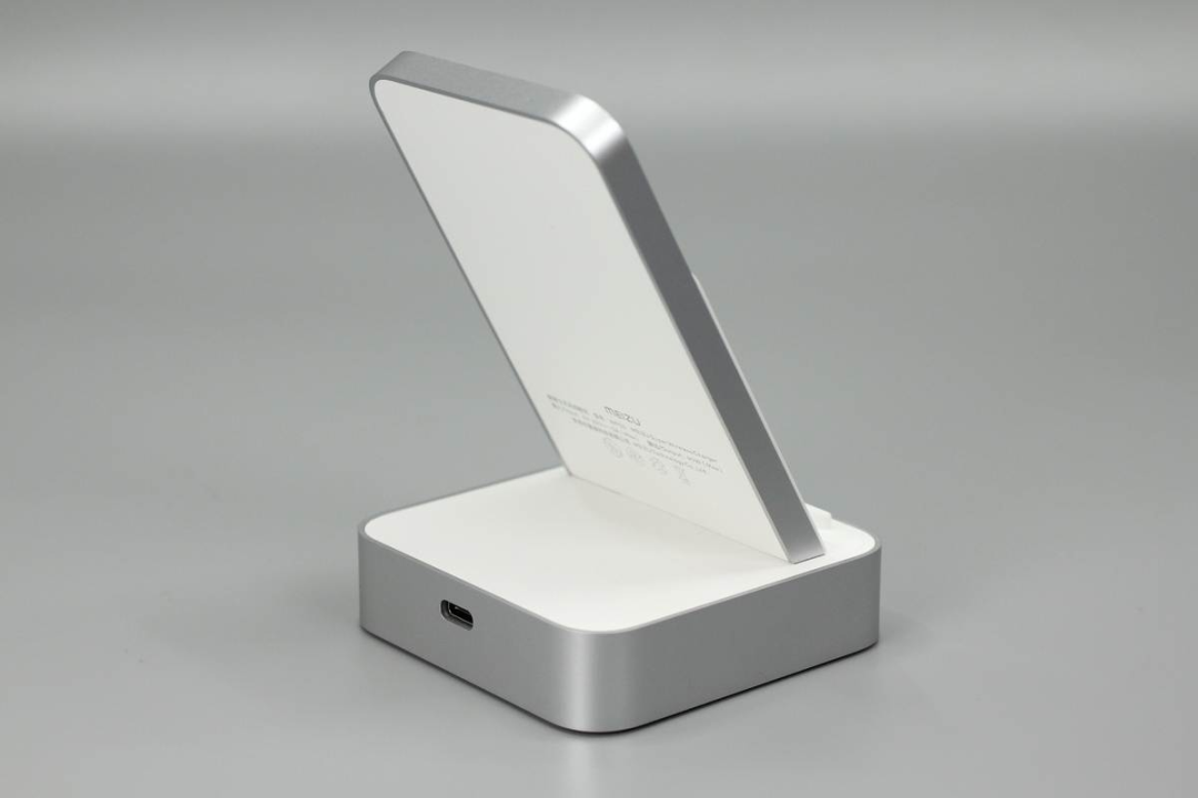 魅族這款無(wú)線充由底座和手機(jī)支撐板兩部分組成,支撐板正面是ABS材質(zhì)鋼化玻璃,十分光滑,支撐板和底座側(cè)身均噴砂銀灰色涂料進(jìn)行裝飾。