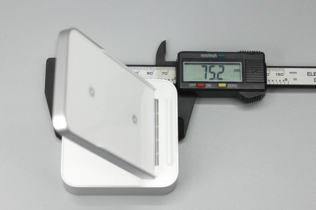 使用游標(biāo)卡尺測(cè)得無(wú)線充底座長(zhǎng)度為75.2mm。