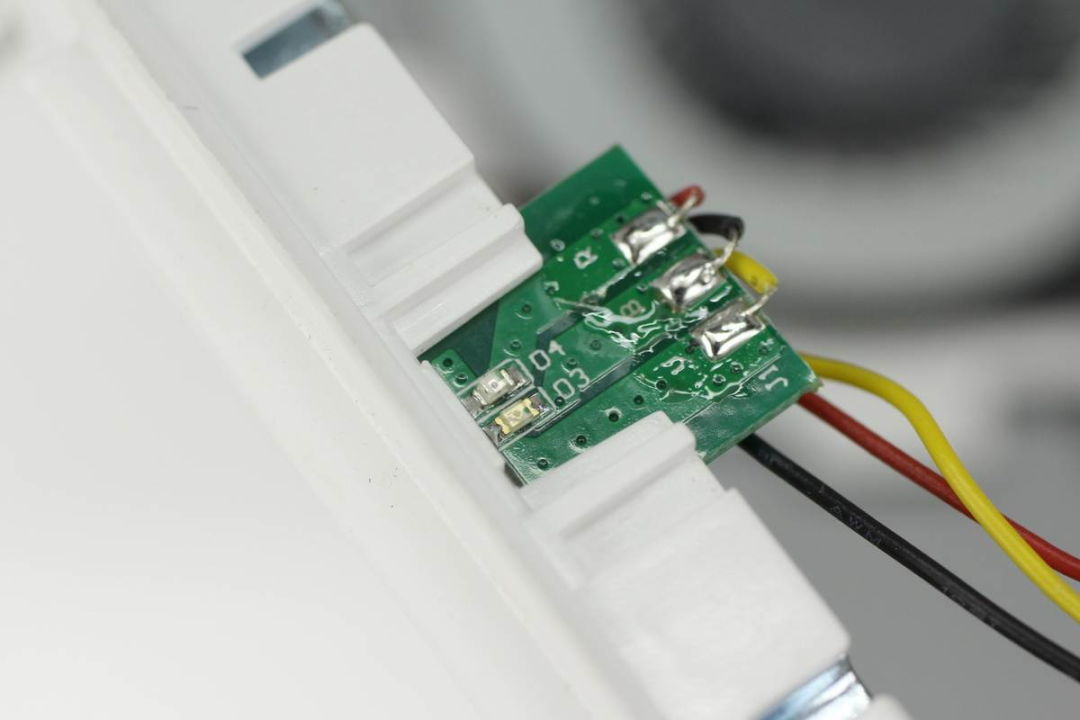 拆掉兩顆螺絲即可將底部外殼打開,風(fēng)扇使用卡扣進(jìn)行固定,并且風(fēng)扇和PCB板間有一塊白色塑料板進(jìn)行隔離。
