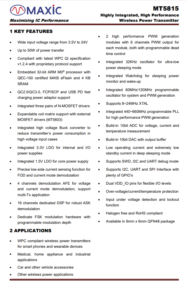 MT5815集成ARM M0 處理器,擁有卓越的高效率和緊湊設(shè)計(jì),適用于各種低成本、低功耗應(yīng)用,可廣泛應(yīng)用于為5G智能終端、智能可穿戴設(shè)備、智能家居、物聯(lián)網(wǎng)、智能家電進(jìn)行無(wú)線充電的設(shè)備。充電頭網(wǎng)此前已對(duì)該芯片做了相關(guān)報(bào)道。
