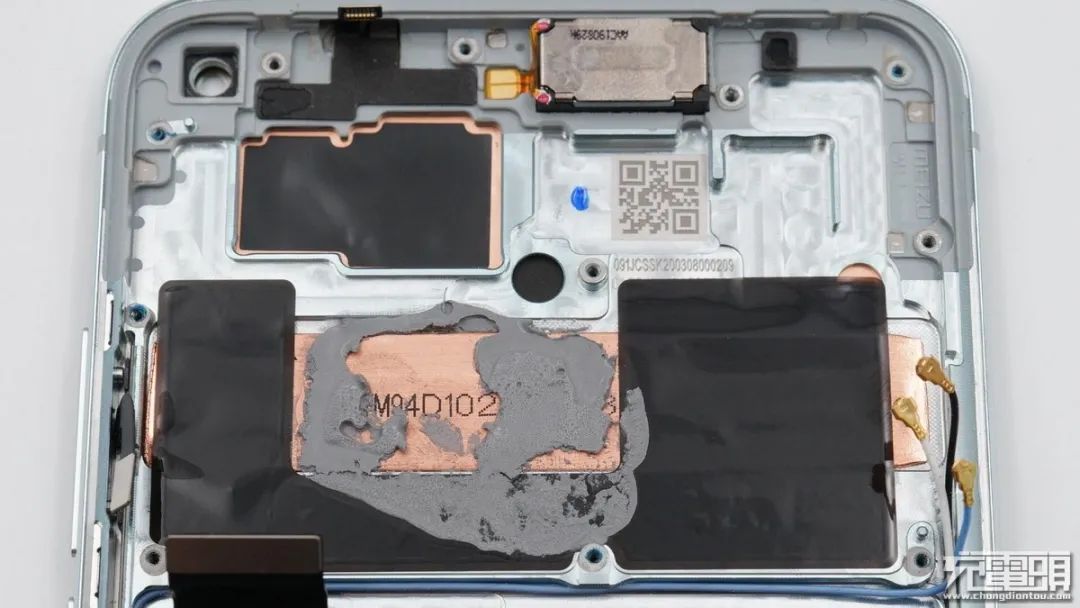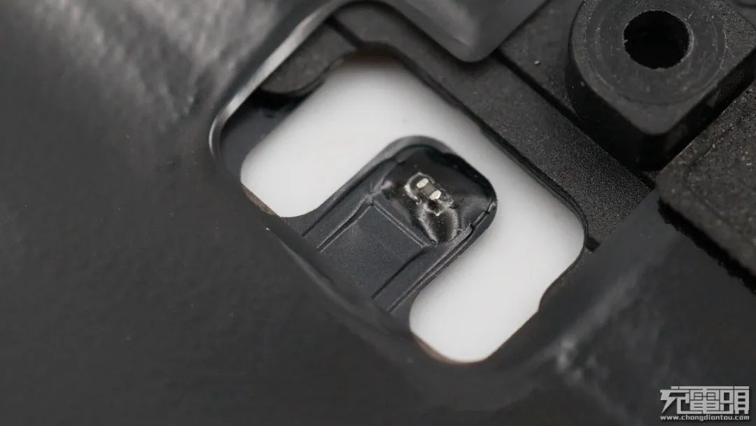 電池和主板之間為插座可拆卸設(shè)計,組裝方便,也方便后面對電池進行更換等服務(wù),同時電池保護板背面與鋁合金中框之間還有一條導熱硅膠,在高速充電時可為保護板散熱,降低溫升。