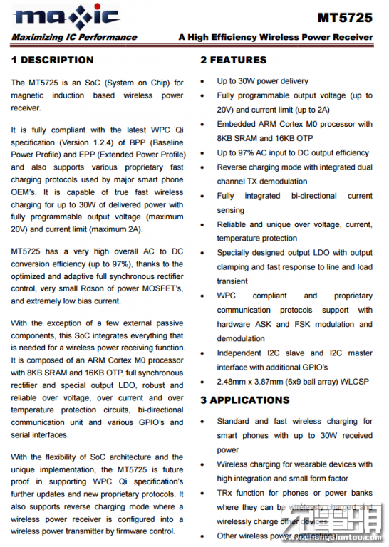 無線充接收芯片采用美芯晟MT5725。MT5725是一款基于磁感應的SoC高集成無線充電接收芯片,集成了無線充電接收功能所需的一切,可提供高達30W的輸出功率。并具有非常高的整體AC/DC轉(zhuǎn)換效率(高達97%)。