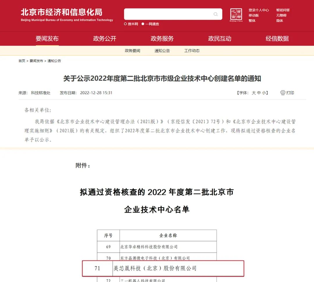 近日,北京市經(jīng)濟和信息化局公布了“2022年度第二批北京市市級企業(yè)技術(shù)中心名單”,美芯晟獲批“北京市市級企業(yè)技術(shù)中心”資質(zhì)。