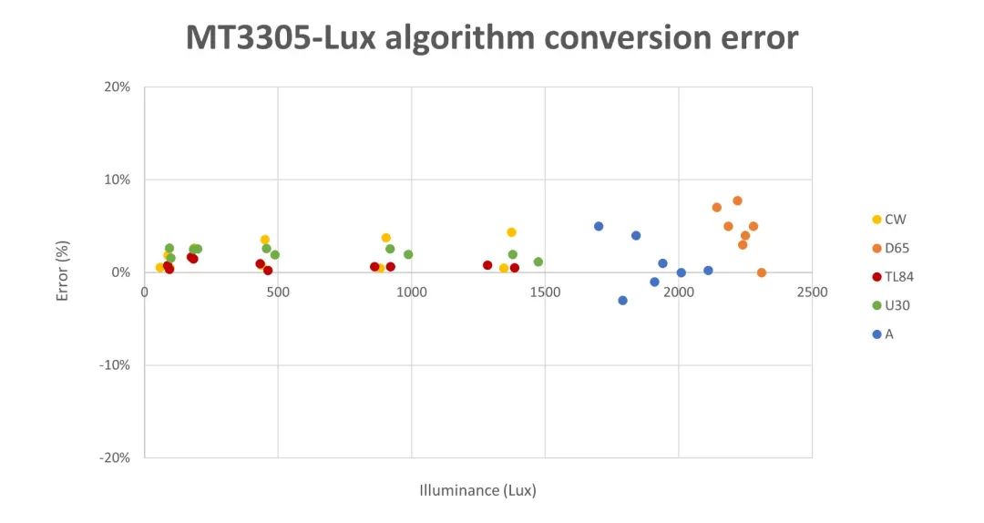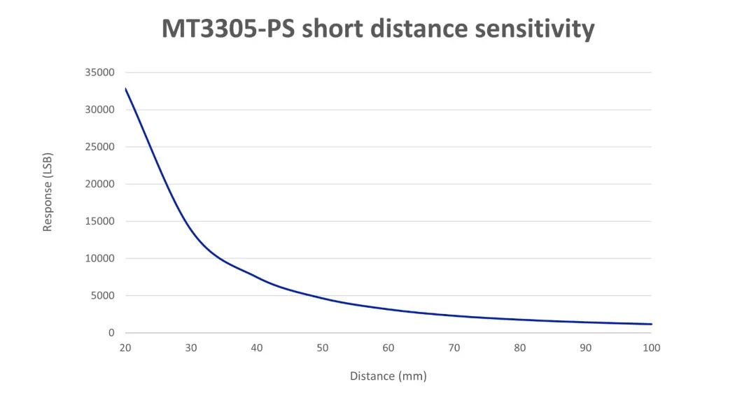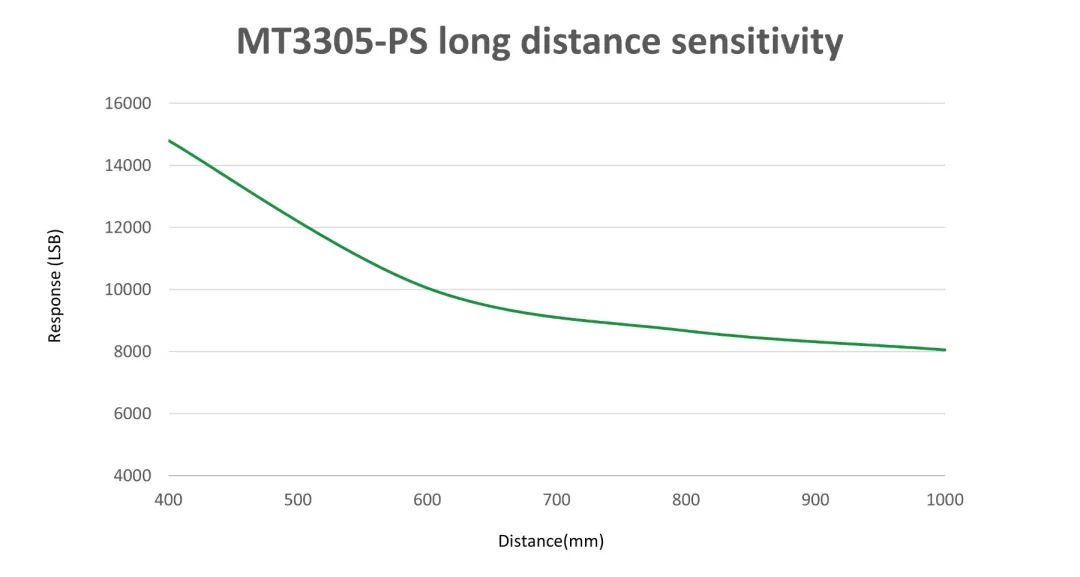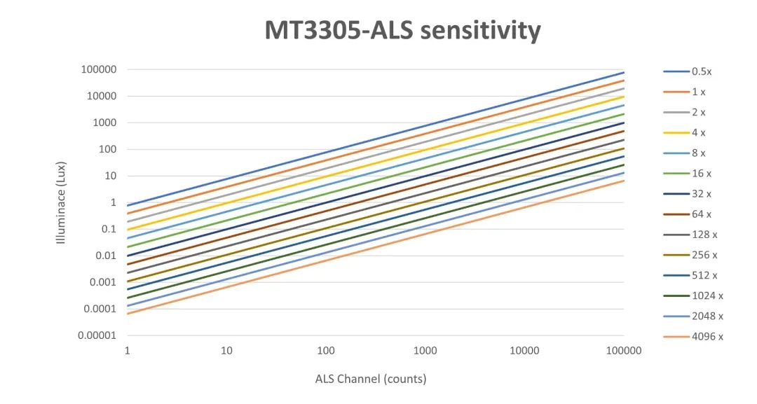 增益范圍越寬,靈敏度越高。MT3305可以實現(xiàn)0.5x~4096x的超寬增益范圍,不僅可以大大增強設(shè)備在暗光下的檢測能力,對強光環(huán)境同樣具備很好的適應(yīng)性。其環(huán)境光檢測靈敏度可達(dá)到<0.0005 Lux/LSB,接近檢測的距離可達(dá)到40cm以上。