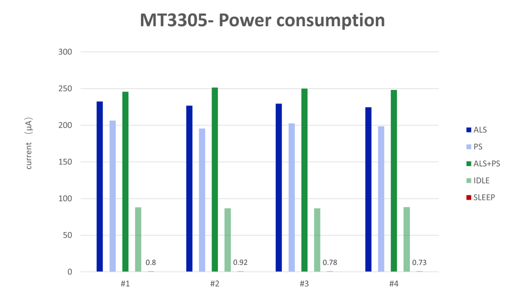 MT3305-SCR&SNR實驗室數(shù)據(jù)對于高性能的傳感器芯片,低功耗是非常關(guān)鍵的參數(shù)指標(biāo)。在提供同等電能的條件下,芯片的待機功耗低至0.7μA,工作功耗最大保持在260μA以內(nèi),這意味著芯片在運行過程中可以增強系統(tǒng)的待機時長,大大降低發(fā)熱量,帶給設(shè)備更好的使用性能。