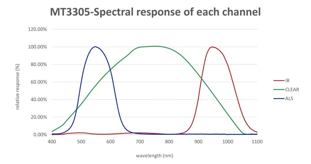 MT3305晶圓采用專用光學(xué)鍍膜技術(shù),可以有效提高光學(xué)特性,通過在感應(yīng)區(qū)上采用不同的鍍膜來實現(xiàn)ALS、IR、CLEAR的光譜響應(yīng)。ALS通道符合人眼響應(yīng)光譜曲線,IR通道以940nm為中心頻點只對高紅外部分光線響應(yīng),CLEAR通道對全光譜進行響應(yīng),結(jié)合美芯晟自研的Lux轉(zhuǎn)換算法,能夠?qū)⒉煌庠聪碌恼斩戎嫡`差有效地控制在10%以內(nèi),使得MT3305的照度識別更加準(zhǔn)確。