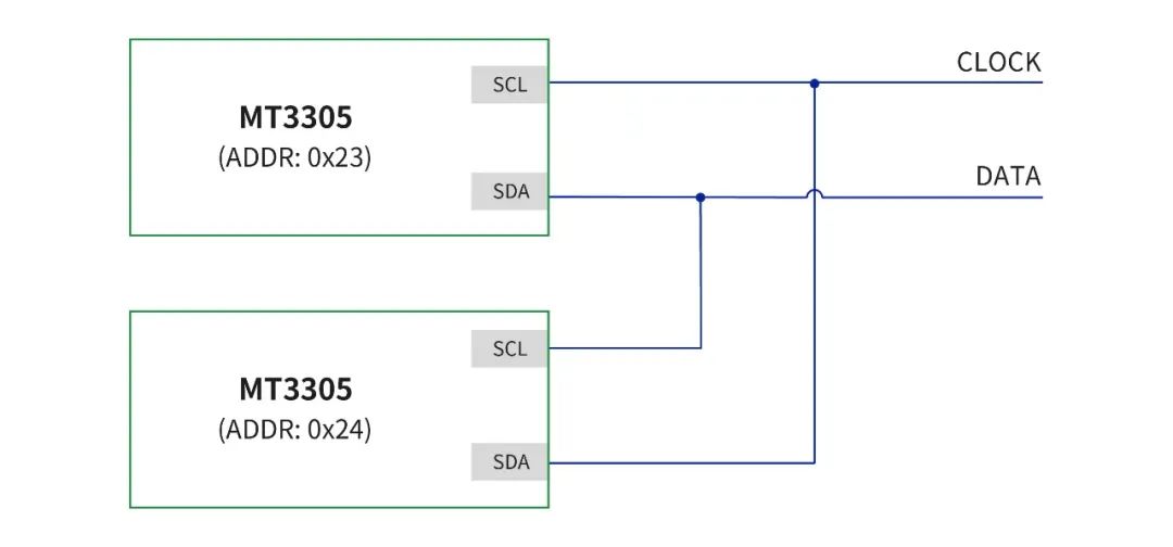 MT3305支持SCL、SDA正反接切換器件地址,可以在一條總線上實現(xiàn)雙芯片同時使用,這樣可以在節(jié)約總線資源的前提下,實現(xiàn)多維度的距離感知、全方位的環(huán)境光強感應(yīng),幫助客戶實現(xiàn)更精準(zhǔn)、更智能的產(chǎn)品應(yīng)用。