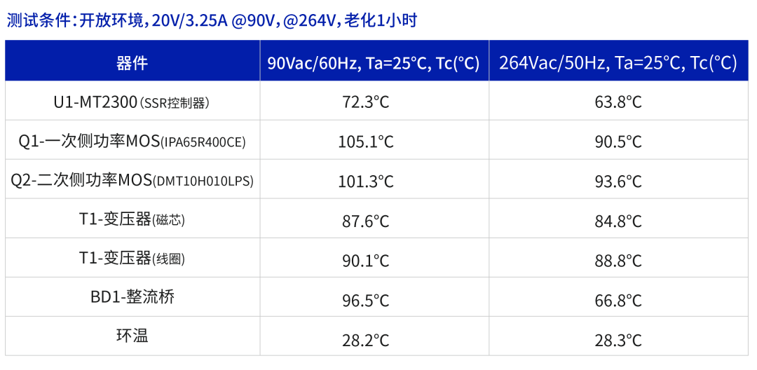 為保證產(chǎn)品的安全可靠性,設(shè)備長(zhǎng)時(shí)間工作導(dǎo)致的發(fā)熱情況也是用戶的關(guān)注點(diǎn)。將方案在開(kāi)放環(huán)境中,以20V/3.25A 65W的功率持續(xù)輸出1小時(shí),各關(guān)鍵器件的溫度均保持在較好的溫度范圍內(nèi),符合安規(guī)要求,可靠性高。
