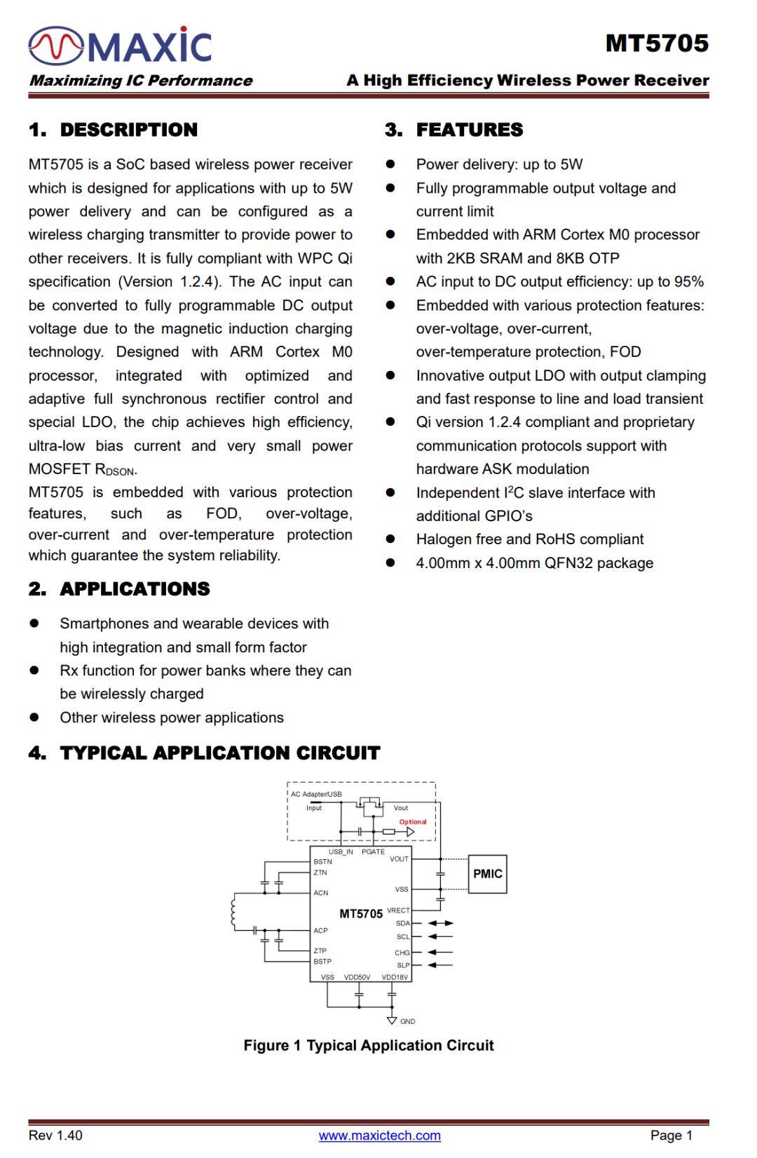 MT5705是一款基于磁感應(yīng)的無線充電接收器SoC(片上系統(tǒng)),采用嵌入式ARM Cortex M0處理器,2KB SRAM,8KB OTP,完全符合BPP的WPC Qi規(guī)范(版本1.2.4)。
