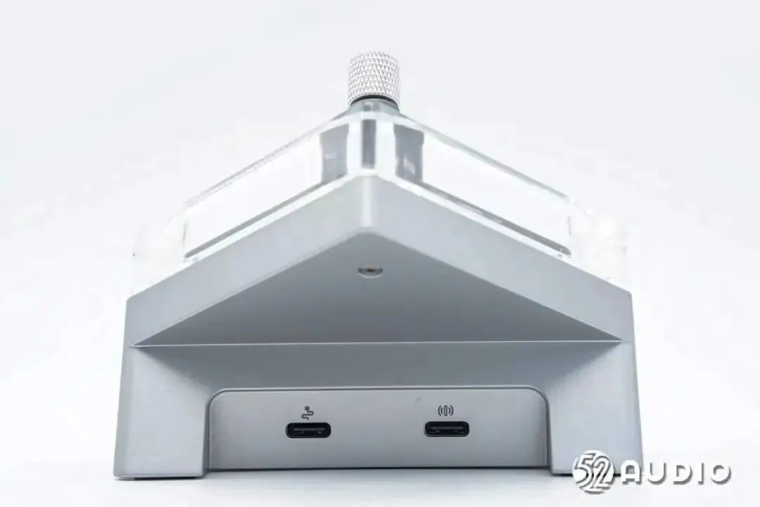 中間固定充電盒的立柱上設(shè)置有金屬旋鈕按鍵,精致滾花設(shè)計(jì),提升了質(zhì)感和使用時(shí)的摩擦力。通過轉(zhuǎn)動(dòng)可以快捷調(diào)節(jié)耳機(jī)音量大小,通過單擊、雙擊、長(zhǎng)按,實(shí)現(xiàn)dongle模式開/關(guān)、游戲/音樂模式和燈效切換。底座背面設(shè)置有Type-C電源輸入接口和dongle接口。