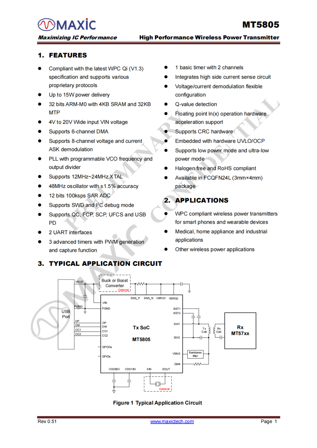 MT5805是單芯片解決方案,內(nèi)部集成32位M0處理器,32KB MTP存儲(chǔ)器和4KB SRAM,符合WPC Qi 1.3規(guī)范,支持私有無線充電協(xié)議,支持功能定制。芯片支持15W輸出功率,4-20V輸入電壓,內(nèi)置快充取電功能,支持UFCS融合快充,PD3.0,QC,F(xiàn)CP,SCP協(xié)議,支持單芯片無線充電器應(yīng)用。