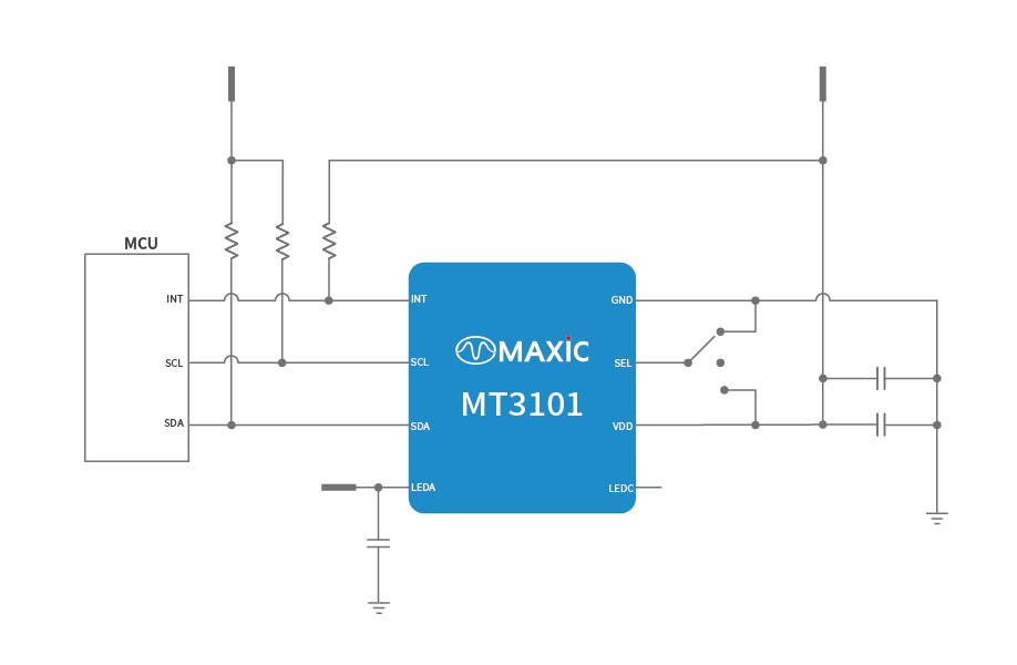 MT3101接近檢測傳感器內(nèi)置數(shù)模相結(jié)合的智能串擾消除技術,能夠最大程度地增大信號可用的動態(tài)范圍,提高抗串擾能力,采用高環(huán)境光抑制設計,搭配高效算法技術,提升紅外線測量數(shù)據(jù)轉(zhuǎn)化為接近檢測結(jié)果的精度,降低誤差值。內(nèi)置9-12 bits ADC用于接近檢測輸出,可編程驅(qū)動電流輸出最大到16mA且脈沖寬度和個數(shù)可配置。I2C 通信接口頻率最高可達400kHz,且支持3種不同的 I2C 識別地址,3顆MT3101可使用同一條 I2C 總線,降低多器件系統(tǒng)電路的設計難度。