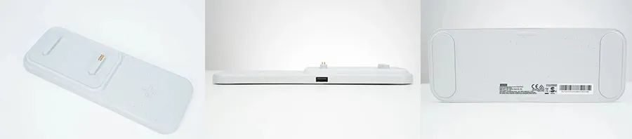 底座為扁平直板造型,四端以及邊緣過(guò)渡圓潤(rùn),表面啞光并有很多五顏六色小圓點(diǎn),使得底座整體看上去像花崗巖一般,右側(cè)凸起。無(wú)線充電區(qū)域設(shè)有十字膠墊,支持穩(wěn)定手機(jī)同時(shí)更好散熱。側(cè)面設(shè)有一個(gè)USB-A接口,黑色膠芯。底部?jī)蓚?cè)設(shè)有防滑膠墊,邊緣貼有產(chǎn)品銘牌貼紙。底座型號(hào)為SE-A61UW,支持12V1.5A輸入,USB-A輸出5V2A,無(wú)線充輸出最大10W,總輸出7.5W(無(wú)線充5W,USB-A口5V0.5A),產(chǎn)品通過(guò)了CE認(rèn)證。