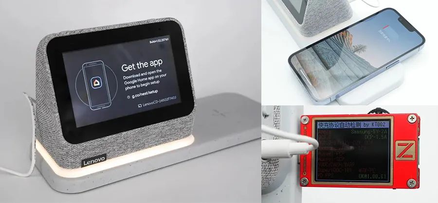 連接適配器并打開開關(guān),首先會(huì)出現(xiàn)一個(gè)讓用戶手機(jī)下載Google Home app的提示界面,即產(chǎn)品支持手機(jī)app智能控制,設(shè)置簡(jiǎn)單方便。底座上的氛圍燈亮白光。同時(shí)可以將手機(jī)放在底座右側(cè)進(jìn)行無(wú)線充電,晚上入睡前為手機(jī)充電變得更加方便。使用ChargerLAB POWER-Z KT002測(cè)得USB-A口只支持Samsung 5V2A、DCP協(xié)議。