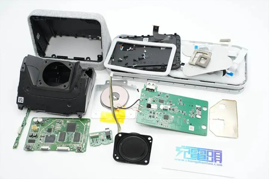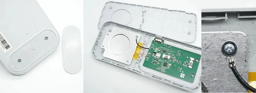 首先撕下底座兩側(cè)粘貼的防滑腳墊,固定螺絲隱藏在腳墊下面。拆開底座外殼,內(nèi)部是無(wú)線充電線圈和用于無(wú)線充電控制的PCBA模塊,無(wú)線充電線圈固定在散熱鋁板上,通過(guò)螺絲固定。接地導(dǎo)線也通過(guò)螺絲固定。