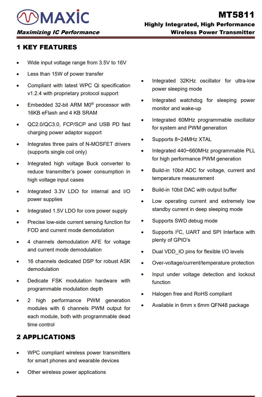 無(wú)線充電芯片來(lái)自美芯晟,型號(hào)為MT5811,是一款集成USB PD、QC等快充協(xié)議、高度集成的符合Qi標(biāo)準(zhǔn)的無(wú)線充電發(fā)射芯片,支持15W輸出功率。MT5811集成ARM M0 處理器,擁有卓越的高效率和緊湊設(shè)計(jì),提供強(qiáng)大、自主的二次開發(fā)空間。芯片內(nèi)部集成3對(duì)NMOS驅(qū)動(dòng)器,可用于單線圈應(yīng)用的無(wú)線充電器,支持定頻調(diào)壓控制,無(wú)需外置驅(qū)動(dòng)器。