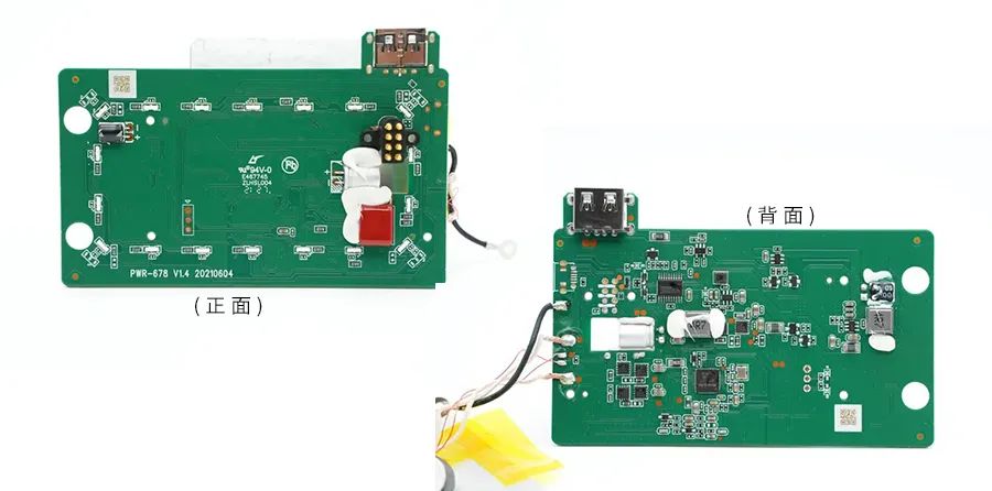 無(wú)線充電PCBA模塊正面特寫,邊緣為一圈LED燈,配合外殼上的導(dǎo)光條營(yíng)造燈光效果。右側(cè)為連接時(shí)鐘的鍍金觸點(diǎn),用于為底座供電。無(wú)線充電PCBA模塊背面為一路完整的無(wú)線充電電路和用于USB降壓輸出供電的降壓電路。